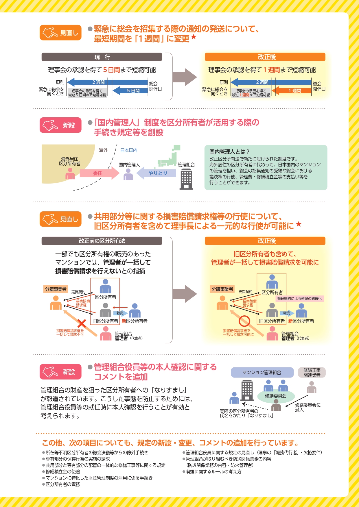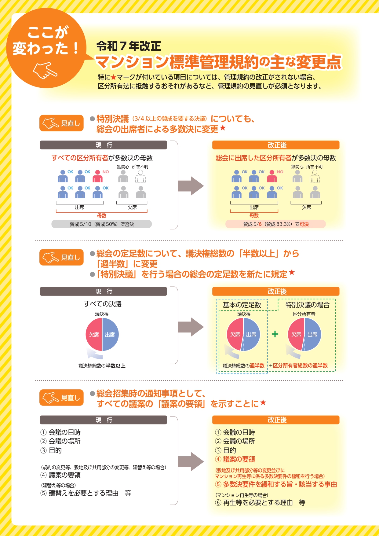 今回の改正は、管理組合の運営に直接関わる極めて重要な内容を含んでおり、各マンションにおける管理規約の見直しが必要となっています。